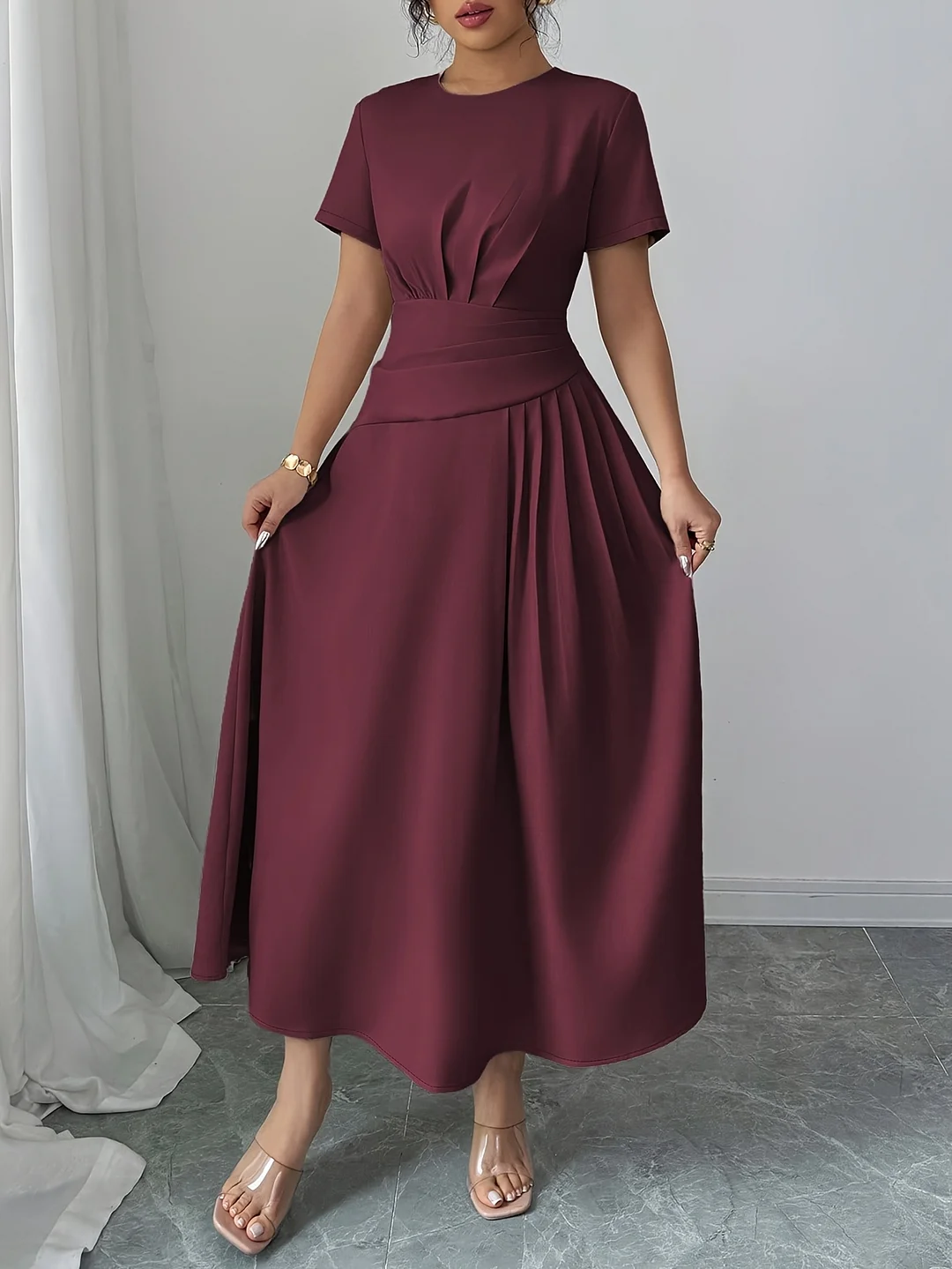 Women's Elegant A-Line Midi Dress - Flattering Office To Party Outfit With High-Waisted Fit, Back Zipper Closure, Flowy A-Line Silhouette For Formal Events, Casual Attire - Burgundy/Deep Red/Black/ Navy/ - All-Season Women's Clothing, Versatile Fashion, Sophisticated Design, Quality Stitching, Fashion Lovers, Work Attire, Durable Material, Professional Women