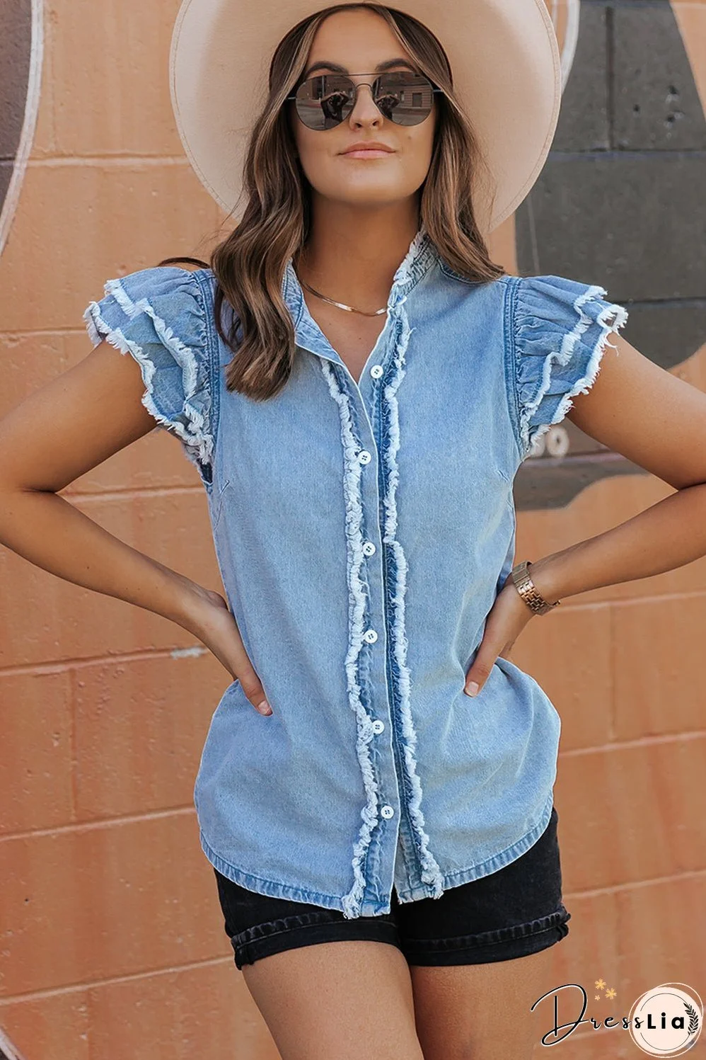 Introducing our Button Front Ruffled Flutter Frayed Denim Top! Perfect for summer outfits or a vintage-inspired look, our women's tee features a unique design and is crafted with high-quality materials for a comfortable fit. Make a statement with this versatile top that is sure to become a new favorite.