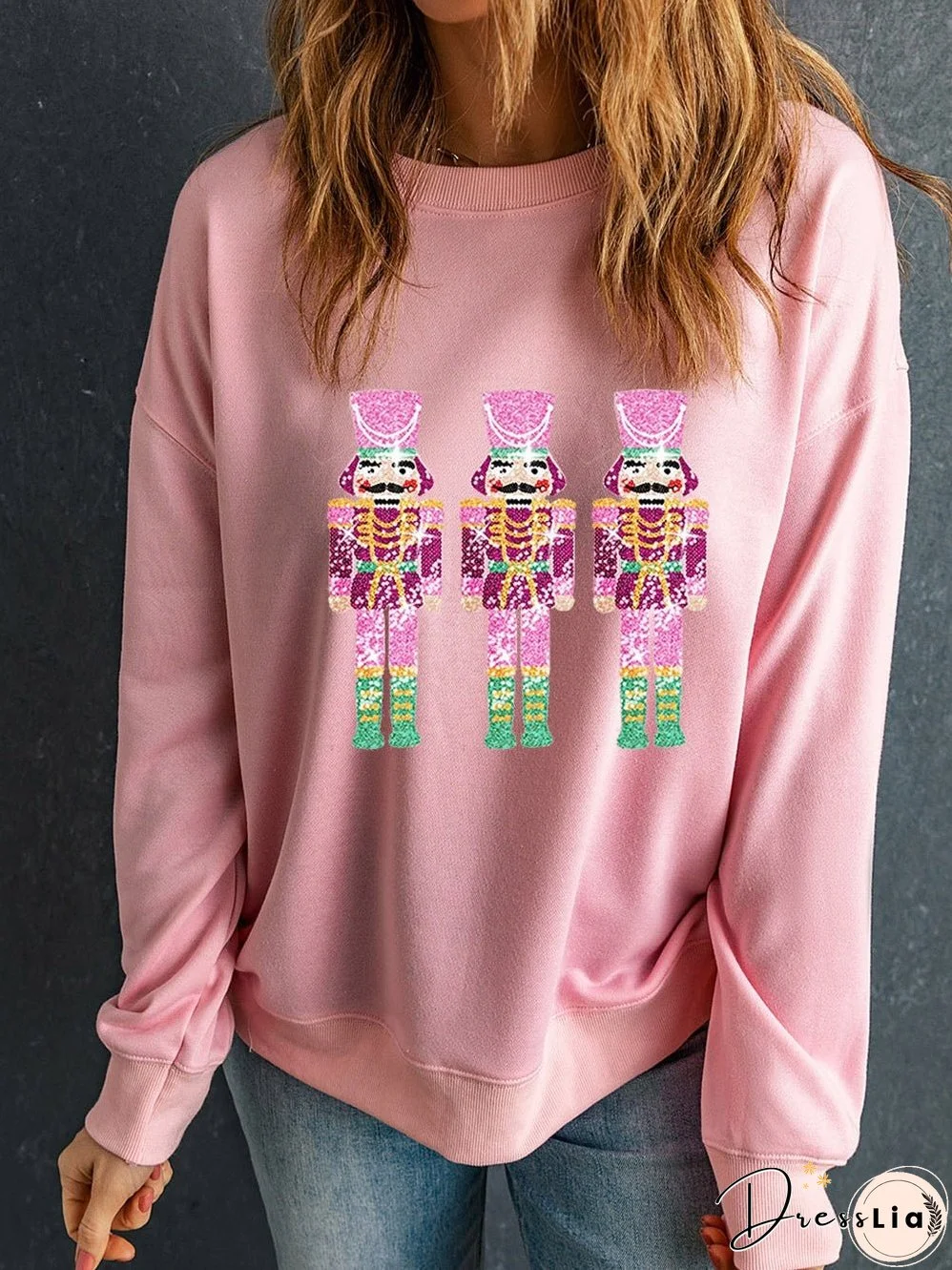 This pink sequin Christmas sweatshirt features three adorable neon nutcracker designs. It's the perfect cozy addition to your holiday wardrobe, offering both comfort and festive style. The sparkly sequins and vibrant colors make it a unique and eye-catching piece. Get yours now!