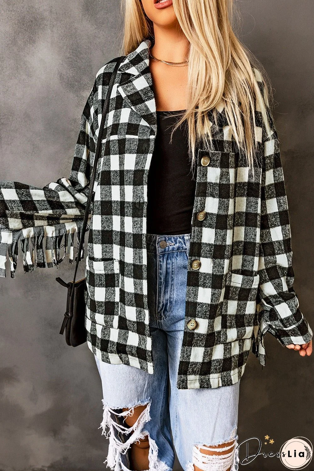 This stylish shacket features a timeless black and white plaid pattern, a relaxed fit silhouette, and fringe details for a classic yet trendy look. Perfect for everyday wear.